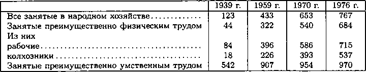 Развитие народного образования привело к резкому повышению образователь-Изменения в уровне образования работников физического и умственного труда (на 1000 человек имеют высшее и среднее [полное и неполное] образование) за период с 1939 по 1976 г*
