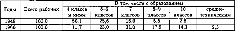 Таблица показывает, что удельный вес рабочих с образованием 7-10 классов и среднетехническим образованием возрос с 24,3% в 1948 г. до 65,3% в 1960 г. Если в 1948 г. не было рабочих, окончивших техникумы, то в 1960 г. свыше 2% рабочих имели законченное специальное среднее образование. За этот период удельный вес рабочих завода, имеющих семилетнее образование, увеличился почти вдвое. Показательным является снижение численности рабочих, не имеющих семилетнего образования, с 75,7% в 1948 г. до 34,7% в 1960 г., в том числе с образованием четыре класса и ниже —с 50,1 до 11,7%. Такие крупные достижения в повышении образовательного уровня рабочих были характерны не только для отдельных передовых предприятий, но и для целых экономических районов.