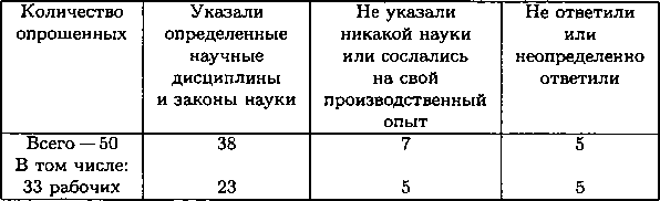 Для выяснения степени применения науки в рационализаторской работе было поставлено несколько вопросов, раскрывающих проблему с разных сторон. Надо было прежде всего установить сам факт обращения рабочих к науке, ее сознательного применения. На вопрос анкеты: «Знание каких научных дисциплин помогло Вам в процессе работы над рационализаторским предложением или изобретением?» — были получены следующие ответы [9]: