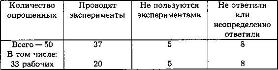 Большинство опрошенных занимались экспериментированием в заводских условиях. Рационализаторы полагают, что без опытов невозможна никакая творческая деятельность.