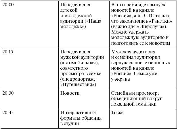 22.00 зритель уже получил необходимую информацию и предпочитает смотреть художественный фильм. Новости в 20.00 конкурируют с федеральным каналом «Россия», где в это время выходит программа «Вести». Поэтому оптимальным для местной информационной программы становится время 20.30. При этом вечерний блок эфира остается на месте с 20.00 до 21.00. Такое программирование позволяет максимально не пересекаться с конкурентами.