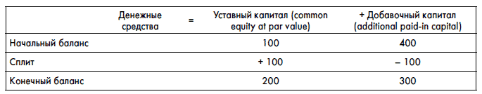 Иногда компании решают, что их акции стоят слишком дорого. Это снижает ликвидность акции, так как мелкие инвесторы такие акции покупают менее охотно. Тогда компания делает так называемый сплит (от англ. to split – разделять на части). Грубо говоря, компания заявляет, например, «с такого-то числа одна старая акция равна трем новым» (сплит может предусматривать любое количество «частей»). В этом случае с точки зрения финансовой отчетности может возникнуть необходимость перевести некоторую цифру из добавочного капитала в уставный. Продолжим предыдущий пример: предположим компания АВС решила сделать сплит своих акций 2 к 1 (когда на каждую старую акционер получает две новые акции). Всего у АВС станет 200 акций. Номинал акций остается неизменным. Компания запишет операцию: