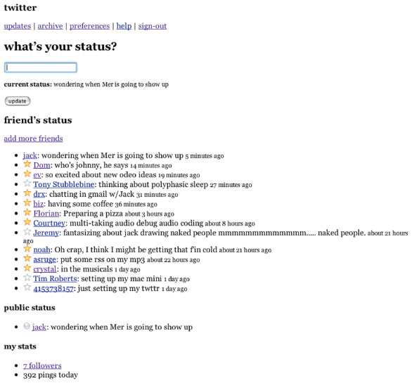 Хороший пример — Twitter (да, снова) в той форме, в которой вы его никогда раньше не видели. В середине 2006 года Twitter можно было принять за клон Craigslist. CSS не было. Простое текстовое окно, простые изображения (желтая звезда и эскиз стартовой страницы), кнопка отправки и нестилизованные <ul>, которые представляли последние обновления статусов людей, на которых вы подписались, в обратном хронологическом порядке (рис. 5.4)[112].