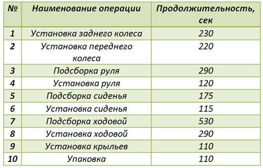 Суммарное время = 2190 секунд без учёта передвижений работников. В данном случае мы заведомо упрощаем пример, округляя в большую сторону время выполнения каждой операции до целых минут, тем самым учитывая перемещение продукта и возможные потери.