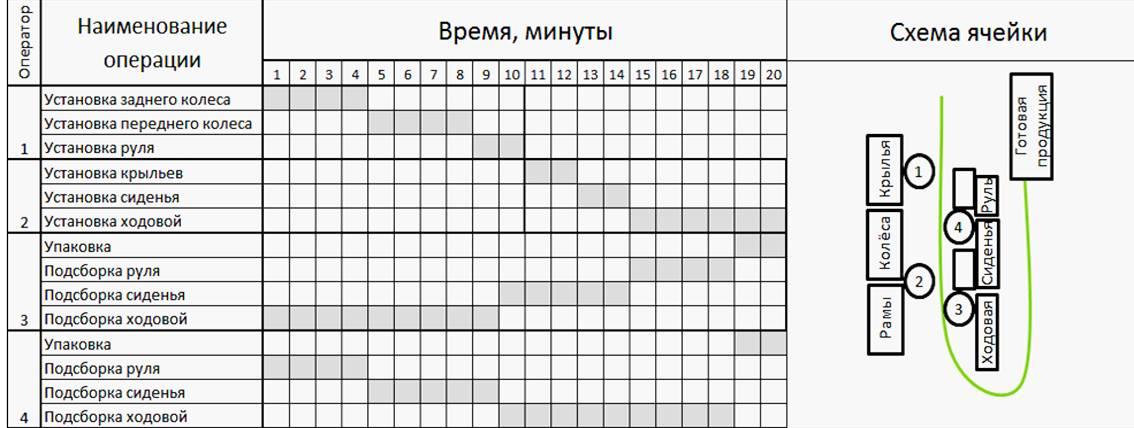 Цикл работы ячейки можно представить следующим образом (см. рисунок 11.5). Для соблюдения технологической последовательности и постоянной скорости потока работа была распределена между четырьмя операторами сборщиками практически равномерно. Если внимательно взглянуть в таблицу стандартизированной работы, то можно увидеть, что два последних оператора выполняют одинаковую работу в различной последовательности, это в данном случае является следствием наличия неделимой операции, превышающей время такта (подсборка ходовой). Тем не менее, согласно таблице, все работы по подсборке завершаются до установки соответствующих узлов, а логистика подвоза комплектующих разделена на крупные готовые узлы (с одной стороны) и подсобираемые узлы (с другой стороны).