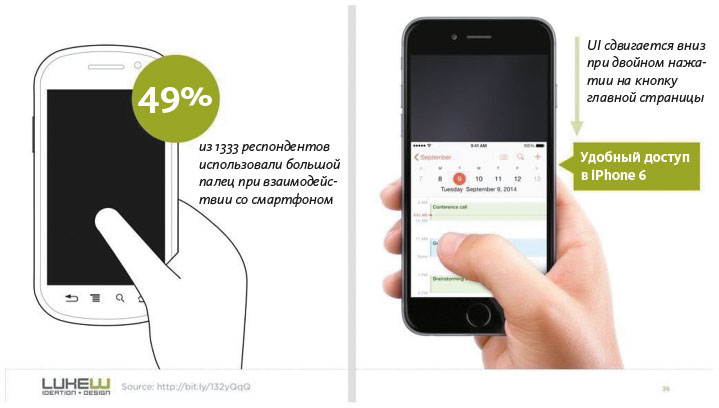 Что означает разрабатывать продукты для больших пальцев? Создавать интерфейсы, удобные для использования при их естественном положении и движении.