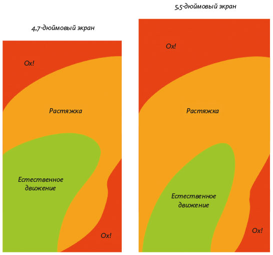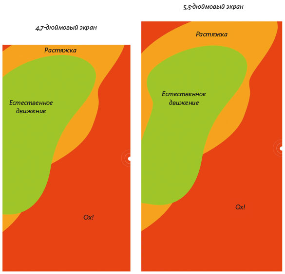 Кроме того, вы могли заметить, что на большом экране изменяется форма зоны естественного движения. Это происходит потому, что из-за размера такой телефон иначе ложится в руку, а мизинец начинает использоваться как стабилизатор. Удивительно, насколько меняется поведение из-за различия менее чем в один дюйм.