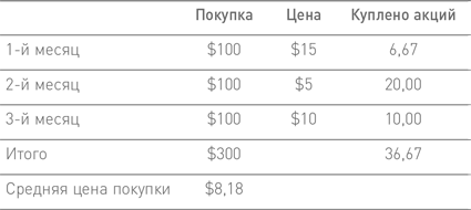 Поскольку больше всего акций было куплено по самой низкой цене, $5, средняя цена покупки составляет $8,18, что ниже средней цены акции за три месяца – $10. Усреднение издержек предполагает, что инвестор приобретает активы через регулярные промежутки времени, тратя фиксированную сумму. Это снижает среднюю цену акции и тем самым повышает доходность.