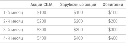 Однако речь идет о совершенно другом процессе. Суммы в таблице представляют собой целевые значения. Это означает, к примеру, что, если активы фонда акций США в начале 3-го месяца стоили $300, а за следующие 30 дней упали на 10 % и стали стоить $270, инвестор должен вложить в этот фонд не $100, а $130, чтобы к началу 4-го месяца итоговая сумма составляла 400 долларов. И наоборот, если зарубежные акции выросли на 10 % и их стоимость составляет $330, следует снизить сумму инвестирования до $70.