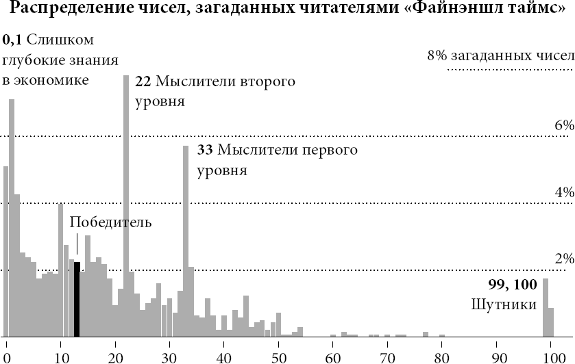 Эта чудесная игра впервые стала предметом исследования в рамках эксперимента немецкого экономиста Розмари Нагел, которая преподает в Университете Помпеу Фабра в Барселоне. Благодаря газете «Файнэншл таймс» в 1997 году у меня появилась возможность воспроизвести полученные ею результаты уже в рамках крупномасштабного эксперимента. Однажды меня попросили написать короткую статью о поведенческой экономике финансовых рынков для газеты «Файнэншл таймс», и я захотел воспользоваться игрой по угадыванию чисел, чтобы пояснить идею Кейнса про конкурс красоты. Затем у меня появилась идея получше: что, если за несколько недель до выхода моей статьи провести среди читателей газеты эту игру в формате конкурса? Таким образом, я смог бы представить свежие данные, полученные на основе опроса читателей «Файнэншл таймс», в своей статье. Согласие со стороны газеты было получено, а компания «Британские авиалинии» предложила разыграть в качестве приза два билета бизнес-классом из Лондона в США. Исходя из того, что вам теперь уже известно, какое, по вашему мнению, число загадали читатели?