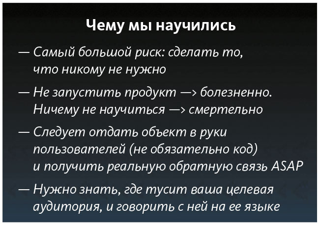 Если я не могу кратко описать [свой продукт] или рассказываю о нем людям, а те совершенно не понимают, о чем речь, или говорят о нем какие-то безумные вещи, — вот что заботит меня больше всего. Думаю, что это самое главное. Вы или не можете описать, или люди просто говорят «мнэ-э» на все ваши объяснения. Но даже если это происходит и при этом по-настоящему веришь в то, что делаешь, то все в порядке. Если вас не понимают, это означает, что следует еще поработать над описанием.