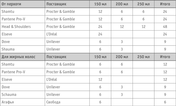 Глубина ассортимента – предлагается каждый бренд в товарной линии. Например, шампунь Head & Shoulders выпускается в упаковках 200 и 400 мл; для нормальных, сухих и жирных волос и т. д. – общее количество порядка 100.