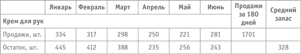 Например, анализируется товарная позиция «Крем для рук» (в табл. «Данные продаж и запасов позиции “Крем для рук”» приведены данные по продажам и запасам за полгода).