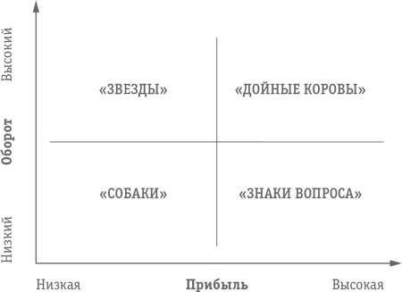 C помощью Матрицы БКГ можно отслеживать и другую связь – оборота товара и прибыли. Пример построения модернизированной матрицы БКГ приводит Владимир Зотов[9].