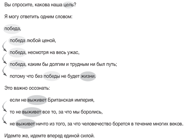 Кроме того, человеческий мозг любит шаблоны и повторы. Повторяющиеся слова или фразы многократно стимулируют инициированный ранее нервный проводящий путь, создавая ощущение приятной логичности, воспоминание о только отзвучавших строках стихотворения, похожих на музыкальный рефрен. Вспомним Уинстона Черчилля – одного из величайших ораторов XX века. Проанализируем фрагмент его первой речи в должности премьер-министра, произнесенной в британской палате общин 13 мая 1940 года (см. рис. 2.1).
