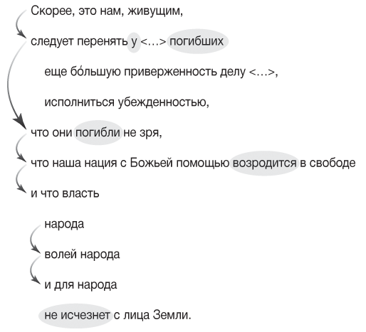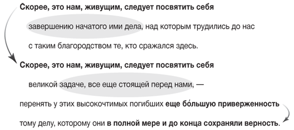 После этого Линкольн использовал еще несколько повторов («посвятить себя», «приверженность») с целью подчеркнуть, что должны сделать живущие ныне для завершения дела, которому «высокочтимые погибшие» «в полной мере и до конца сохраняли верность» (рис. 2.4).