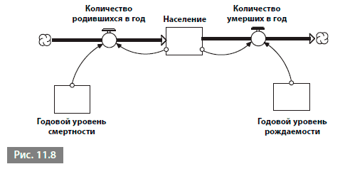 Во-вторых, диаграммы запасов и потоков гораздо точнее называют переменные. Например, в диаграмме цикличной причинности рост населения мы называли просто количеством родившихся, в то время как на диаграмме запасов и потоков у нас есть количество родившихся в год, что подчеркивает связанный со временем характер потоков. Это тоже отражает точность, требуемую для моделирования.