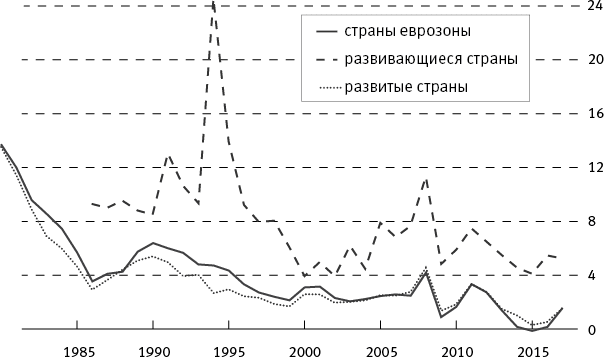 Это только кажется, что большинство экономических сюрпризов, то есть ситуаций, когда происходящее сильно отличается от прогноза, негативны. Первые десять лет XXI века экономисты во всем мире ждали более высокого роста цен, чем оказывалось на деле. Ни макроэкономический кризис развивающихся стран в 1997–1998 годах, ни сначала выросший, а потом лопнувший интернет-пузырь, ни последовавшая американская рецессия, ни высокие темпы роста по всему миру в последние годы не оказали существенного влияния на рост цен. Мировой финансовый кризис 2008–2009 годов еще сильнее его замедлил: инфляция снизилась буквально повсеместно. К середине второго десятилетия ничего не изменилось, хотя американская экономика росла без перерыва уже шесть лет. Инфляция оставалась очень низкой.