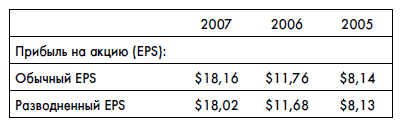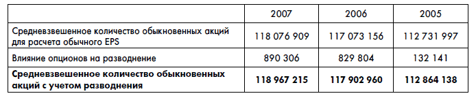 Чтобы потенциальные инвесторы могли оценить размер возможных дополнительных акций, компании в своей финансовой отчетности должны представить дополнительные данные о чистом и разводненном доходе на акцию. Чистый доход на одну акцию (earnings per share, или EPS) – это чистая прибыль, деленная на выпущенное компанией количество акций. Разводненный доход на акцию (diluted EPS) – это чистая прибыль, деленная на общее потенциальное количество акций, которое компания должна/может выпустить в соответствии с имеющимися у нее обязательствами, включая и опционные программы. Например, вот данные из отчетности Евразхолдинга: