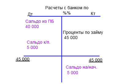 Дт «Проценты по займу» Кт «Расчеты с банком по %%» 45 000.