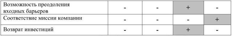 В примере, приведенном в таблице 4.3 единственной слабостью является несоответствие производственных мощностей объему потребности рынка (левее разделительной границы затемнен только один квадратик). Это означает, что при выходе продукта на рынок спрос не будет удовлетворяться, а следовательно, и развиваться в достаточной степени. Задача компании очевидна и заключается в развитии производственных мощностей.