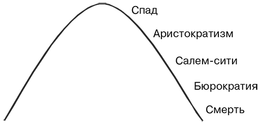 По мере продвижения по жизненному циклу цели организации меняются (рис. 7). На этапе аристократизма вследствие ограничения долгосрочной перспективы у организации вырабатывается новый стиль поведения. Атмосфера становится все более застойной. Значение имеет не то, что люди делают и чего добиваются, а то, как они это делают. Пока человек «не высовывается» и не «гонит волну», он вполне может выжить и даже получить повышение. Наличие достижений – или их отсутствие – не имеет большого значения.