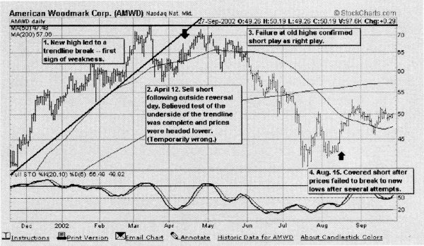 Рисунок 5-12. 15 апреля, после дня «внешнего разворота», Родз открыл короткие позиции по акциям производителя бытовых товаров American Woodmark. Поначалу позиция ушла в минус, но вскоре цена налетела на уровень сопротивления, после чего обвалилась. Четыре месяца спустя позиция была закрыта с 24-процентной прибылью.