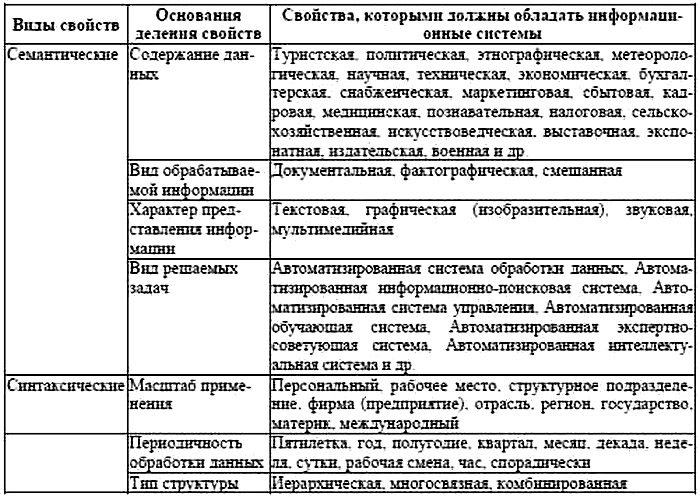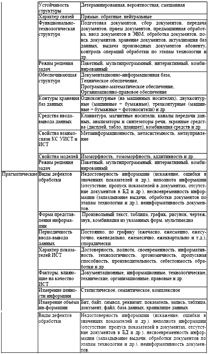 Выявление свойств можно выполнить методом классификации ИСТ. Основанием деления выбираются существенные признаки с позиций характера решаемой задачи в семантическом, синтаксическом и прагматических аспектах. Выделим и рассмотрим отдельные категории из фрагмента классификации свойств (таблица 3.8).