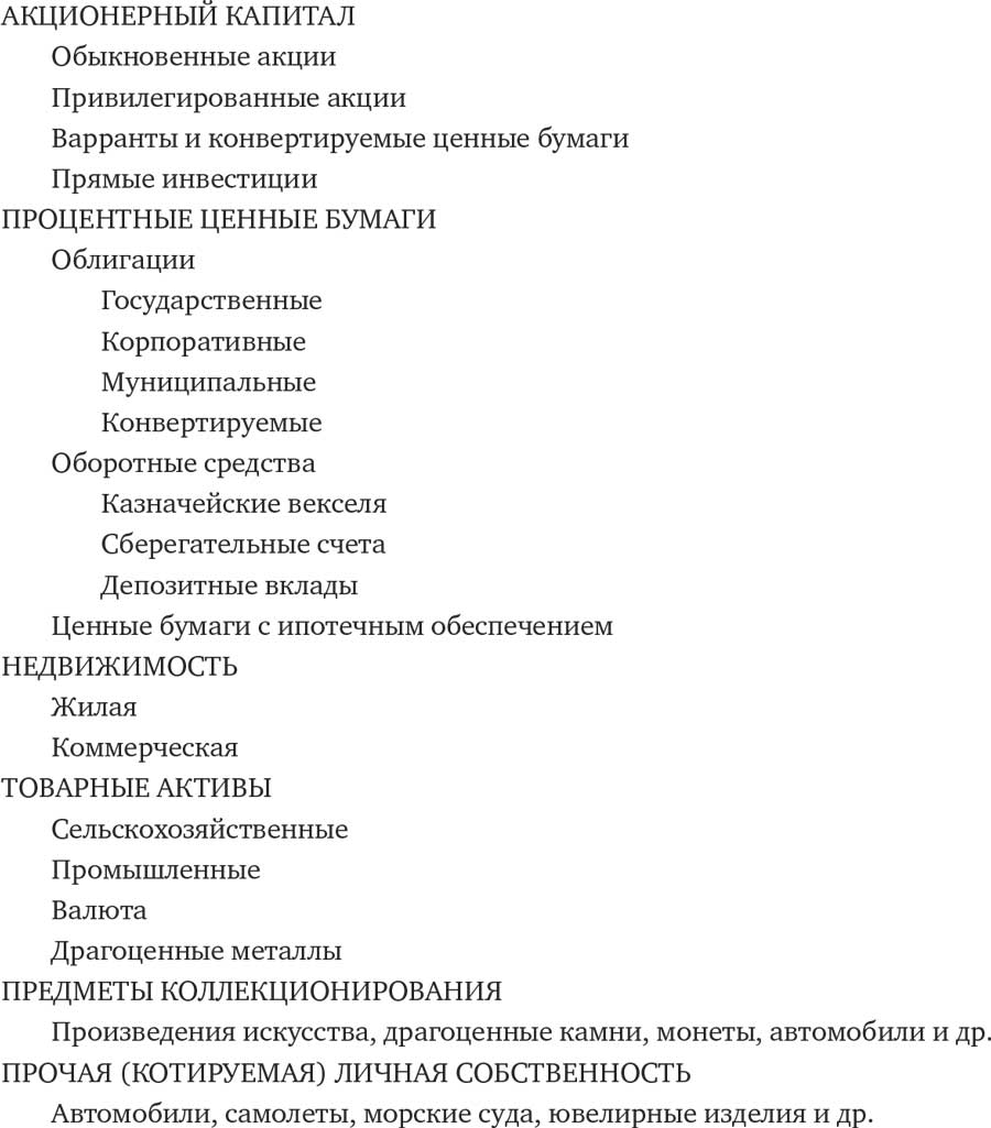 В промышленно развитых странах частные капиталы распределены по нескольким основным классам активов – акциям (обыкновенным), облигациям, недвижимости, предметам коллекционирования, товарам и разнообразному личному имуществу. Если инвестор выбирает индексные фонды для каждого класса активов, в который он хочет инвестировать, то совокупный риск и совокупная доходность его портфеля зависят от их распределения по классам активов. Это же справедливо и для инвесторов, не работающих с индексами. В таблице 8 приведена приблизительная сводка категорий активов. В нее не включены инвестиционные активы, находящиеся в распоряжении паевых фондов, хедж-фондов, благотворительных фондов и фондов участия в прибылях, так как их основные активы уже учтены в других статьях[302]. Как мы уже видели, ценность производных финансовых инструментов, в том числе варрантов, опционов, конвертируемых облигаций и многих других замысловатых изобретений, порождается некими «основными» ценными бумагами – например, обыкновенными акциями соответствующей компании. Мы не перечисляем их по отдельности, а подразумеваем, что они входят в категорию соответствующего основного актива.