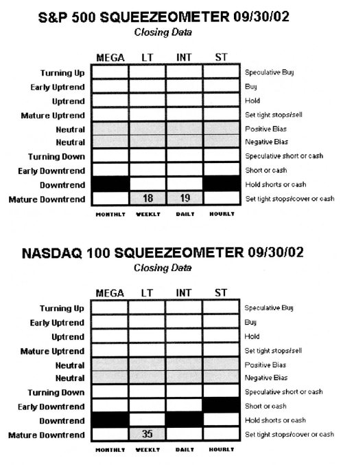 Рисунок 6-3. Эрланджеровский «Измеритель вытеснения» по S&P-500 и NASDAQ представляет собой нормализованную детрендовую версию индекса VIX. Он группирует минимальные и максимальные значения индекса волатильности в 10 видов ценовых движений от «разворачивающийся вверх» на стороне покупки до «сформировавшегося нисходящего тренда» на стороне продажи, подразделяя их по четырем различным временным измерениям: месячному (мегатренд), недельному (долгосрочный тренд), дневному (среднесрочный тренд) и часовому (краткосрочный тренд). Фил представляет временные периоды в качестве волн, а инвесторов – в качестве серферов. Попытка работать на часовом тайм-фрейме напоминает, по его словам, серфера, пытающегося оседлать дождевые капли, а месячные волны вполне сравнимы с прибоем на Гавайях. Когда индикаторы в недельной и дневной колонке перемещаются в две самые верхние клетки, значит страх на рынке достиг своего апогея и настало время покупать. На данном рисунке приводится информация за 30 сентября 2002 года: два промежуточных тренда на минимуме, следовательно, настала пора закрытия коротких позиций. Временной момент был определен с исключительной точностью – на следующий день S&P-500 взлетел вверх на 4 процента.