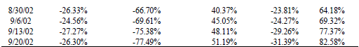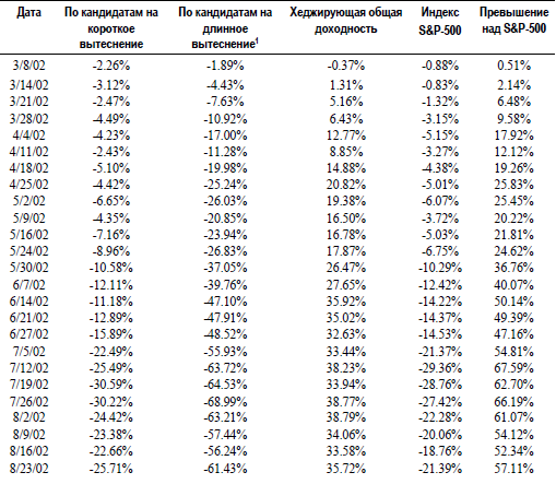 Каждую неделю на сайте Эрланджера обновляется список ведущих кандидатов на вытеснение коротких и длинных позиций. Институциональные инвесторы, являющиеся подписчиками на его рассылку, каждый день получают информацию об акциях, включенных в «Техническую шкалу», «Шкалу коротких позиций» и «Шкалу силы». Трейдер, уплативший в качестве ежемесячной платы всего 29.95 долларов США за право доступа к услугам сайта, может использовать такие списки акций либо в качестве исходного материала для более детальных и глубоких собственных исследований, либо попросту для продажи и покупки бумаг – кандидатов на вытеснение длинных и коротких позиций. Такая техника давала прекрасные результаты в период с марта по сентябрь 2002 года, как это видно из ниже приводимых таблиц. В Таблице 6-1 представлены абсолютные результаты по обеим категориям акций за каждую неделю в течение указанного периода. Таблица 6-2 содержит накопительные результаты недельной доходности по всем коротким и длинным позициям. Как видно из таблиц, открытие длинных позиций во время вытеснения коротких, позволяет трейдеру получить результат немного лучший, чем у индекса S&P-500. А при комбинации позиций по обеим категориям на вытеснение, трейдер мог бы получить 52 процента прибыли против -32 процентов убытка по индексу S&P-500.