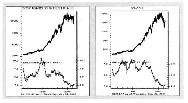 На рисунке 6-5 обратите внимание на массированные короткие продажи индексов в середине 90-х. Эрланджер вспоминает, что большинство инвесторов всерьез опасались полного развала рынков. Ведущие аналитики Уолл-стрит, используя фундаментальный анализ, тщетно пытались обосновать резко увеличившийся негативный настрой рынка на фоне растущих цен. Слова Алана Гринспэна по поводу «иррационального изобилия» отнюдь не уменьшили беспокойства участников рынка, связанного с резким взлетом фондовых индексов. Беспрецедентный подъем цен, в конце концов, смел с рынка короткие позиции середины 90-х. Вне всякого сомнения, их закрытие сыграло большую роль в процессе установления рекордных пиковых значений – при вытеснении коротких позиций несчастные медведи, вынужденные закрывать позиции с убытком, гнали цену еще выше. Четкое понимание ситуации, в которой оказались цепляющиеся за свои короткие продажи медведи, помогло Эрланджеру сохранять бычий настрой на всем протяжении восходящего тренда. К концу 90-х годов объемы коротких продаж упали до минимального значения за многие десятилетия, после чего уязвимость рынка стала очевидной.