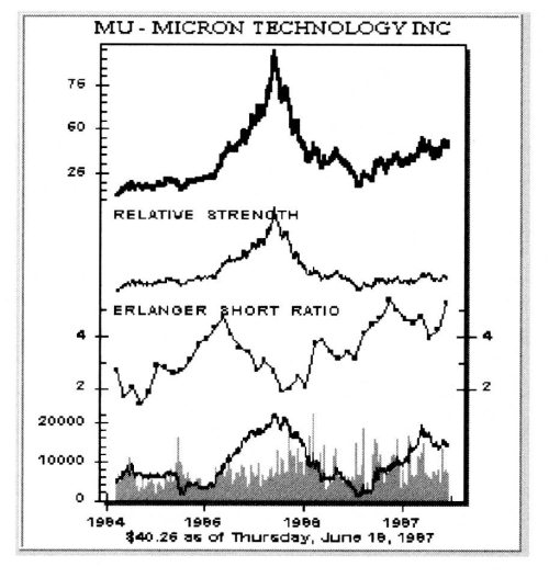 В 1994-1997 годах акции Micron резко выросли в цене на фоне растущего коэффициента коротких позиций и вытеснения медведей.