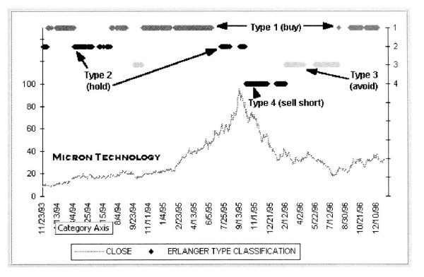 Рисунок 6-7 демонстрирует классификацию моделей в действии во время мощных ценовых движений акций Micron с начала 1993 по конец 1996 года. Важно отметить небольшое количество изменений в самих рекомендациях. Эрланджер советовал своим клиентам держать акцию на всем протяжении подъема с $20 до $90. Он утверждает, что с помощью подобной классификации моделей намного проще описывать рекомендуемые действия.