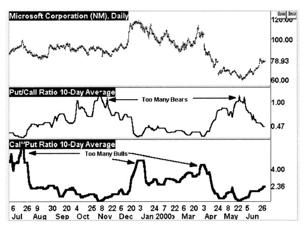 На примере акций Microsoft Corporation (MSFT) в 1999-2000 годах (см. рисунок 6-8) Эрланджер показывает возможность выявления четкой взаимосвязи экстремальных проявлений рыночного настроения и будущего движения цены. Медвежий настрой значительно увеличился в четвертом квартале 1999 года. Затем, в течение всего нескольких недель акция подорожала более чем на 30 процентов. Как следствие, настроение рынка изменилось с медвежьего на крайне бычье. Явным сигналом сформировавшейся к началу 2000 года вершины стало взрывное увеличение покупок колл-опционов. Более того, по времени это совпало с началом судебных тяжб корпорации Microsoft с правительством. Большинство аналитиков полагали, что отношение трейдеров к вопросу дробления корпорации можно оценить как нейтральное.