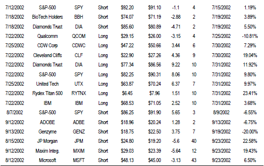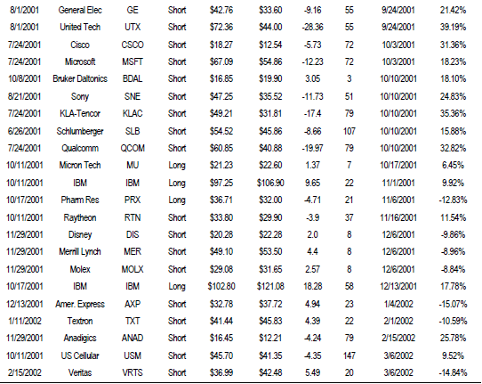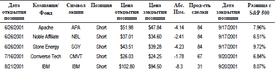 Теперь давайте изучим список фаворитов Эрланджера за 2001 -2002 годы (см. Таблицу 6-3) и посмотрим, как он использует свои теории настроения рынка и силы движения для совершения на удивление точных среднесрочных свинговых сделок.