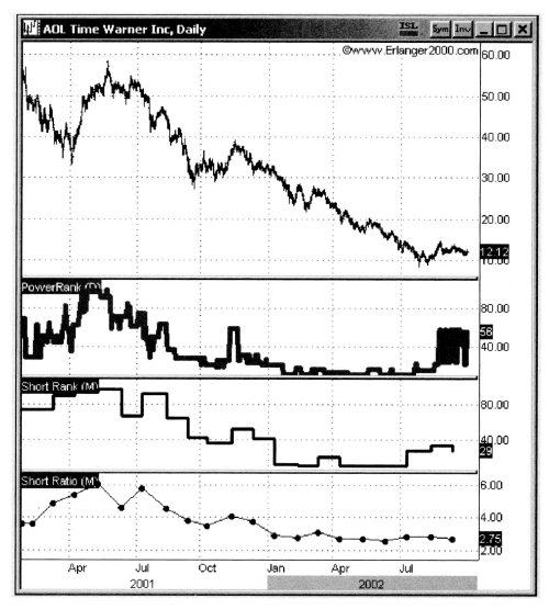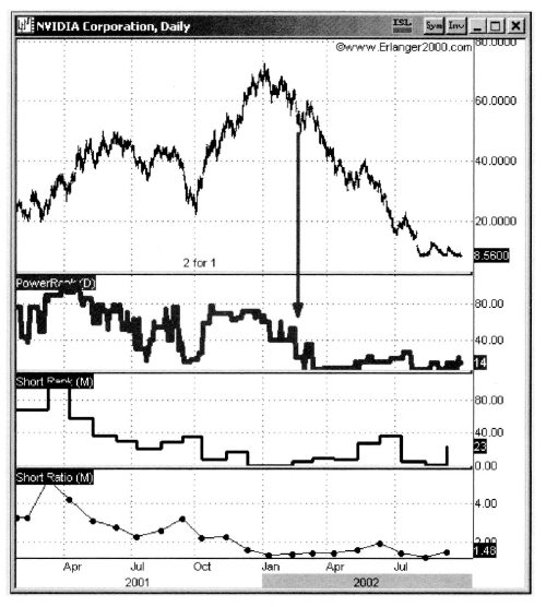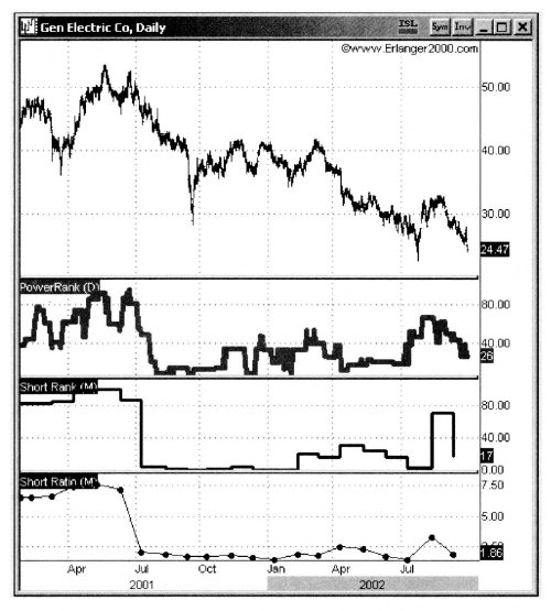 С другой стороны, существует и «вытеснение длинных позиций» – то есть низко котируемые по «Шкале силы» акции. Такие бумаги пользуются огромной любовью у инвесторов, и по ним почти нет коротких позиций. Но, в конце концов, рынок приходит к выводу, что они не такие уж идеальные, после чего их цена катится вниз. В 2002 году Эрланджеру удалось «поймать» почти все трагические падения, включая General Electric (GE), Philip Morris, Brocade Communications и Tyco International. Каждая из этих бумаг перед обвалом вниз оказалась в нижней части его «Шкалы силы».