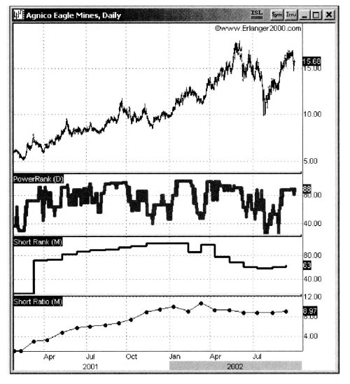 Оборотная сторона монеты представлена примером с акциями Agnico Eagle Mines (см. рисунок 6-11). Это – самая лучшая сделка Эрланджера по образцовому портфелю за тот период, и она была длительной. Он выступил с рекомендацией на покупку этой акции в ноябре 2001 года, когда бумага стоила 9.81 долларов, задолго до того, как большинство людей пришло к выводу о надвигающейся бычьей фазе рынка в секторе драгоценных металлов. Акция отвечала всем предъявляемым к покупке требованиям: растущие значения шкалы силы, технической шкалы и шкалы коротких позиций.
