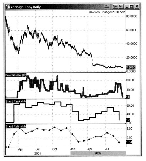 Компания VeriSign, специализирующаяся на услугах интернет-безопасности (см. рисунок 6-12), имела высокое значение коэффициента коротких продаж в течение почти всего 2001 года, когда цена двигалась в торговом диапазоне от 35 до 65 долларов за акцию. В январе 2002 года она упала до $20, после чего практически все короткие продажи были прикрыты. По-видимому, все посчитали, что худшее уже позади. Совокупность низкого значения шкалы силы с низкими объемами коротких позиций сделали ее в мае идеальным кандидатом для Эрланджеровской модели вытеснения длинных позиций. Бумага оправдала ожидания аналитика, упав с 20 до 5 долларов за акцию в течение нескольких следующих месяцев. «Судя по всему, открывшие короткие позиции медведи были уверены в том, что цена остановится на $20», -говорил Эрланджер – «поразительное благодушие! С тех пор она упала еще на 75 процентов, а объемы коротких позиций все еще невелики!».