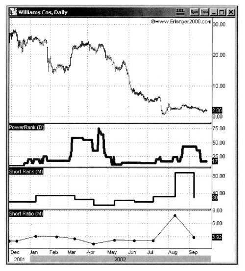 Еще один пример падения цены на акции в виде комбинации малых объемов коротких продаж и слабой силы движения цены относится к истории с гигантским нефтяным и газовым поставщиком Williams Cos в 2001-2002 годах. С апреля по июль 2002 года объемы коротких продаж находились на низком уровне, несмотря на то, что значение шкалы силы акции упало ниже 25 процентов. Эрланджер поместил ее в список Модели 4 (вытеснение длинных позиций) в качестве кандидата на продажу с рекомендацией удерживать позицию до цены в 3.5 доллара, который предположительно должен быть достигнут на волне всплеска объемов коротких продаж. «Когда интенсивность коротких продаж возрастает, я выхожу из игры», – говорил он.