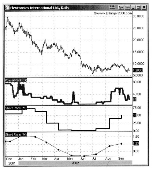 Итак, теперь у вас имеется «Шкала коротких позиций», с помощью которой измеряется интенсивность коротких продаж, а также «Техническая шкала», по которой оценивается относительная сила движения цены. Объедините их и вы получите «Шкалу силы» Эрланджера (Power Rank). Чем выше располагается акция в данном классификаторе, тем выше интенсивность коротких продаж и сила ценового движения. Таким образом, идеальным выбором Эрланджера стала бы акция, короткие продажи по которой достигли бы исторического пика, и которая, несмотря на это, двигалась бы вверх со скоростью, превышающей среднюю скорость движения рынка. Высокое место в «Шкале силы» означает акцию, двигающуюся против коротких позиций, которые, в конце концов, придется закрыть. Это и есть вытеснение коротких позиций, которое может привести к огромному по масштабу свинговому движению.