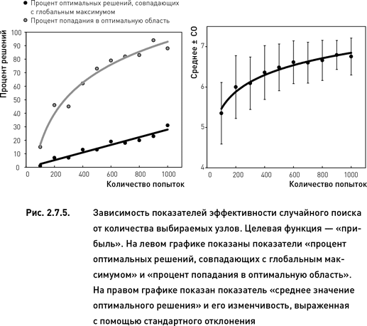Как и следовало ожидать, значения всех показателей растут по мере увеличения количества случайно выбранных узлов (рис. 2.7.5 и 2.7.6). Однако темпы этого роста зависят от каждого конкретного показателя. Более того, форма зависимости эффективности поиска от количества попыток различна для разных показателей. Процент оптимальных решений, совпадающих с глобальным максимумом, увеличивается линейно с ростом количества проверенных узлов. С другой стороны, процент оптимальных решений, расположенных в оптимальной области, и среднее значение целевой функции всех оптимальных решений растут нелинейно по мере увеличения количества попыток: в начале рост происходит быстрыми темпами, затем дальнейшее увеличение числа попыток приводит лишь к незначительному росту эффективности поиска.