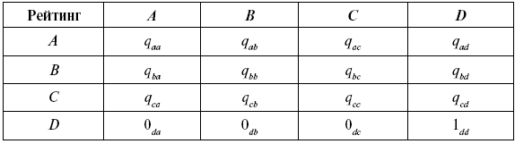Значения qij – вероятность, с которой компания изменит текущий рейтинг i на рейтинг у. Соответственно диагональные строки, где i =j, означают вероятность того, что компания не поменяет рейтинг. В нижней строке нули, потому что предполагается, что компания уже не может выбраться из состояния дефолта, поэтому изменение рейтинга D на какой-либо другой невозможно. Таким образом, рейтинг D выступает так называемым абсорбирующим уровнем, и вероятность перехода в него с любого другого qid является вероятностью наступления дефолта для актива с рейтингом i.