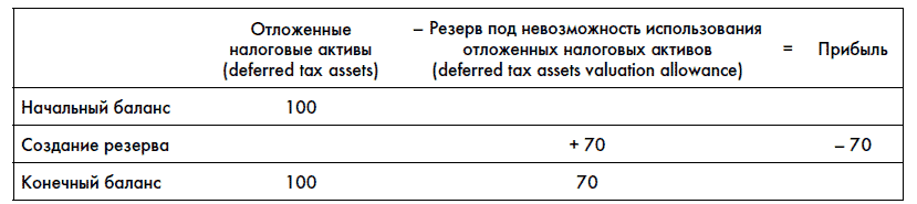 Тот же принцип применяется и для отложенных налоговых активов. В некоторых случаях у менеджмента и аудиторов могут возникнуть сомнения в том, что будущие прибыли компании будут достаточно большими, чтобы компания смогла реализовать отложенные налоговые активы (т. е. «вернуть» деньги, «одолженные» государству). В этом случае компания должна создать резерв под невозможность использования отложенных налоговых активов. Резерв создается в активной части баланса и уменьшает чистую стоимость отложенного налогового актива. Например, если у компании есть отложенный налоговый актив на 100 руб. и компания считает, что сможет его реализовать только на 30 %, на остальные 70 % (на 70 руб.) создается резерв: