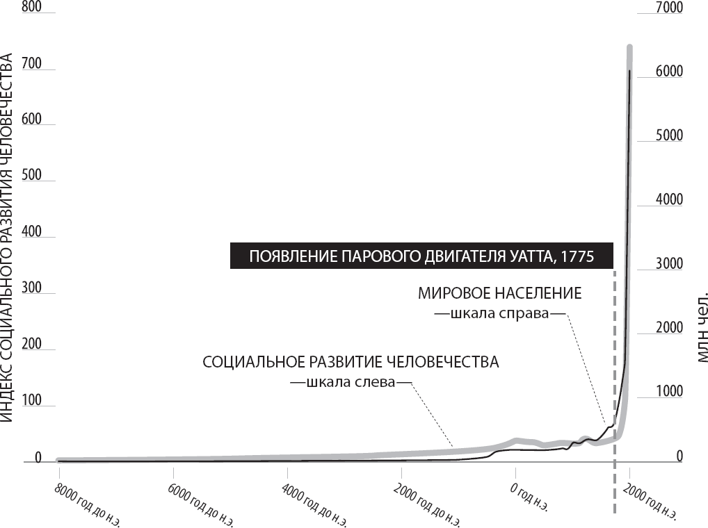 Возможно, вы уже догадались, о чем идет речь. Эта книга посвящена влиянию технологий, поэтому вполне можно предположить, что мы начинаем ее рассказом о том, насколько важную роль могут играть технологии. Внезапному изменению в графике в конце XVIII века соответствует достижение, о котором мы уже много слышали: промышленная революция, представлявшая собой сумму нескольких почти одновременных достижений в областях машиностроения, химии, металлургии и некоторых других. Поэтому вы, скорее всего, уже поняли, что именно эти технологические достижения лежат в основе внезапного, резкого и продолжительного скачка в прогрессе человечества.
