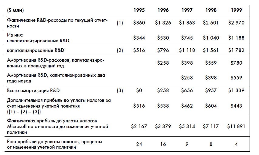 Что же произошло на самом деле? А на самом деле Microsoft, хотя и имела возможность капитализировать свои затраты на разработку, добровольно не стала этого делать, даже несмотря на то, что в том году было выпущено специальное разъяснение FASB (регулирующего органа США, устанавливающего бухгалтерские стандарты), позволяющее компаниям, разрабатывающим программное обеспечение, капитализировать расходы согласно упомянутым выше принципам. Вот выдержки из комментариев к финансовой отчетности Microsoft за 1999 г.: