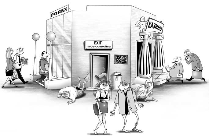 Как мы уже говорили, трейдинг (активные спекуляции на фондовом рынке) хорош для тех, кому не хватает адреналина. Максимальный адреналин можно получить от валютных спекуляций на Forex. Это настоящее валютное казино! Большинство игроков на Forex проигрываются в пух и прах, причем быстро. Меньшинству, чтобы проиграться в пух и прах, требуется чуть больше времени. В конечном счете «выигрывают» 2 % игроков, зато серьезно. Единственный, кто всегда остается в плюсе, – это сам Forex.