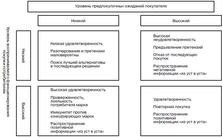 Удовлетворенность потребителя зависит от его предпокупочных ожиданий. На рисунке 3.5 показаны варианты послепокупочной оценки потребителем продукта и его поведения. Эта оценка и поведение определяются воспринимаемым уровнем функционирования покупки в процессе использования и уровнем предпокупочных ожиданий покупателя.