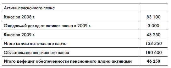Предположим, что компания оплатила обязательства по пенсии дяди Вани за 2009 г. только наполовину, т. е. перечислила в пенсионный фонд 46 250 руб. по обязательству плюс 2000 руб. для компенсации недополученных процентов. Тогда пенсионные активы и пенсионные обязательства компании не будут равны друг другу – у завода образуется дефицит фондирования пенсионного плана: