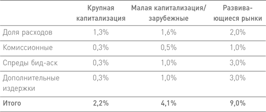 В первой строке представлена доля расходов, которые состоят из комиссии за управление средствами и других более мелких административных сборов; во второй – комиссионные, которые фонд платит брокеру; в третьей – разница между ценой покупки и продажи, которую уплачивают все инвесторы, торгуя на фондовом рынке; в последней – дополнительные издержки, которые несут управляющие крупными фондами, такие как Миллер. Третья и четвертая строки в совокупности отражают «транзакционные издержки» торговли на фондовом рынке, которые уже рассматривались в данной главе.